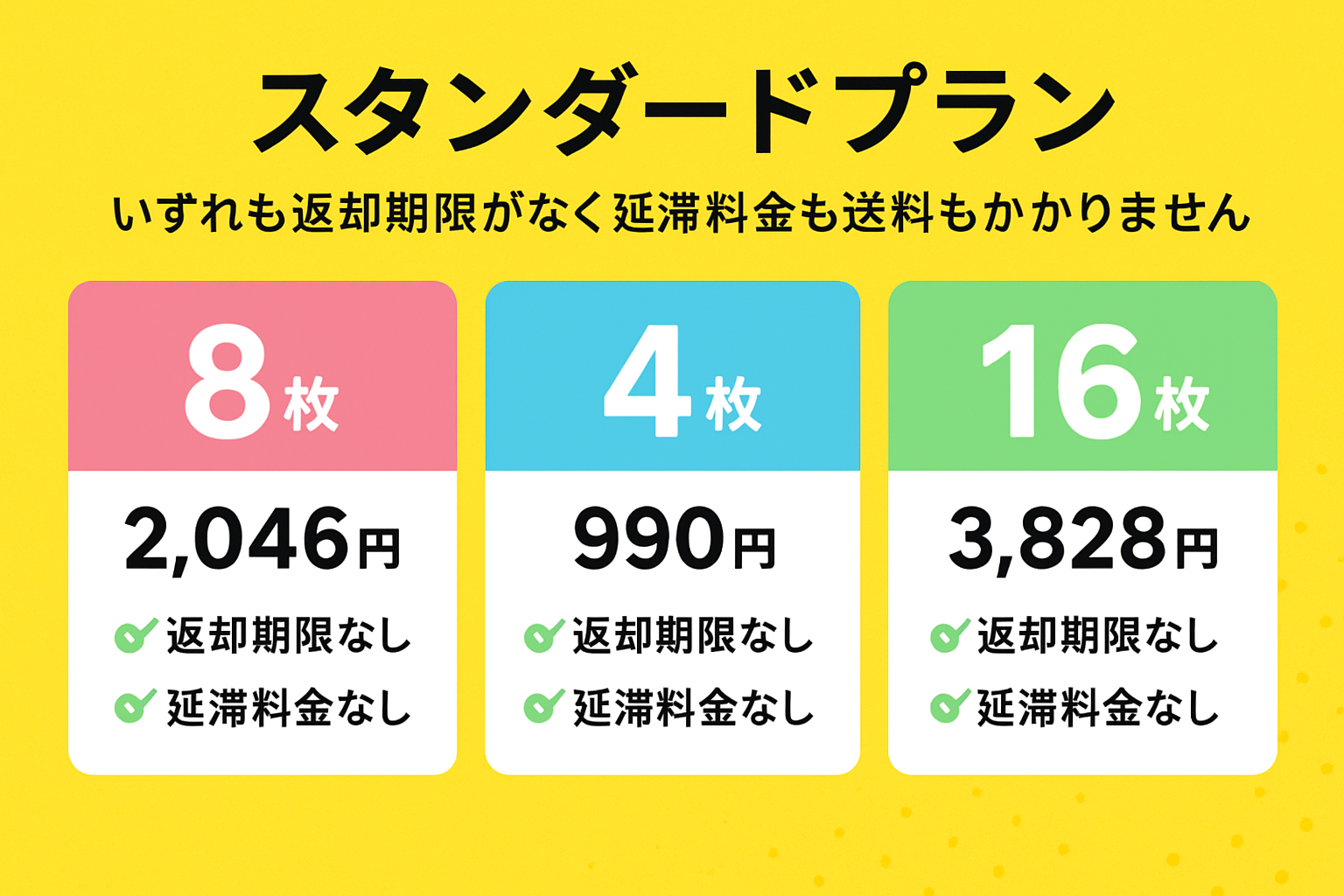 スタンダードプラン(4/8/16枚)はいずれも返却期限がなく延滞料金も送料もかかりません。